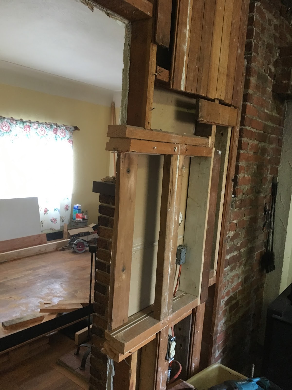 about 40 years ago, the home owner drywalled this pathway closed, creating a small window with a sliding pocket door. The opening has now been restored to the original.